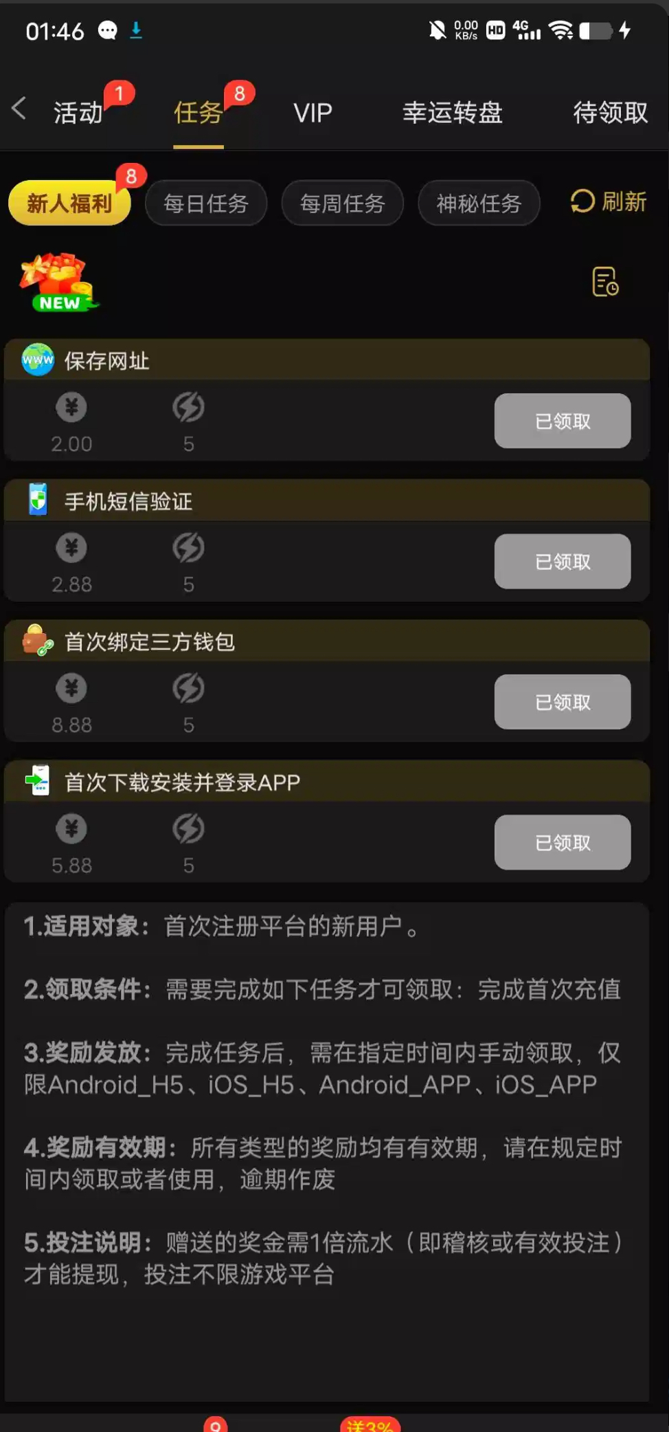暂时不黑任务彩金要第二天才能领取,自己看 789.vip